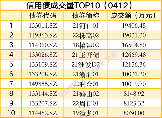 信用债方面,截至4月12日17:00,交易所成交量前三的债券为:21河口01、22株高02、18榕建02;交易所涨幅前三的债券为:19金科03、16融创07、19碧地02。