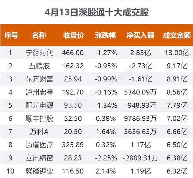 4月13日,北向资金当日成交净买额-4.98亿元。其中,沪股通当日成交净买额为3.89亿元;深股通当日成交净买额为-8.87亿元。