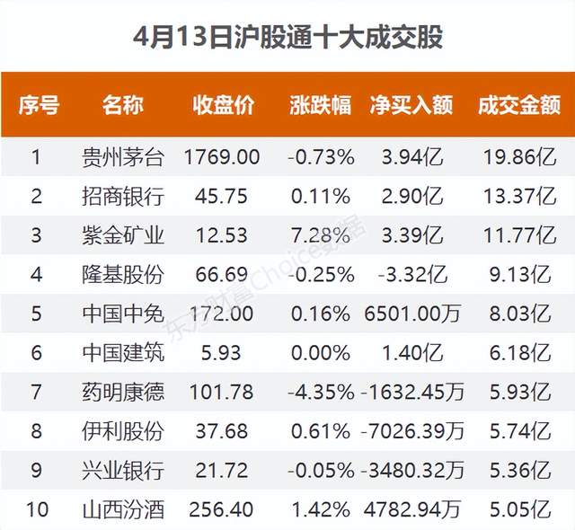 交易所公布的沪深港通十大成交股显示,今日北上资金大幅净买入贵州茅台3.94亿元,净买入紫金矿业3.39亿元,净买入宁德时代2.83亿元,同时大幅净卖出隆基股份3.32亿元。