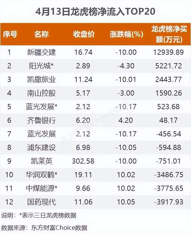 4月13日,上榜龙虎榜个股中,资金净流入最多的是新疆交建,为1.67亿元。数据显示,该股日内跌停收盘,全天换手率11.69%。资金净流入居前的深股通席位净买入1.29亿元,中金上海分公司净买入3653.4万元。