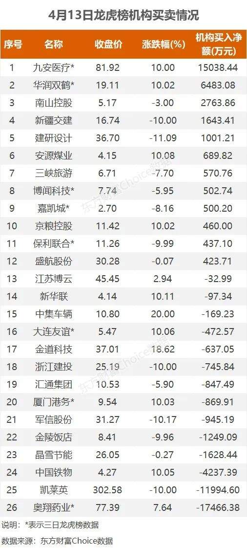 机构参与龙虎榜中个股共涉及26股,其中12股被机构净买入,九安医疗被买入最多,三日净买入1.5亿元。另外14股被机构净卖出,奥翔药业被卖出最多,三日净卖出1.75亿元。