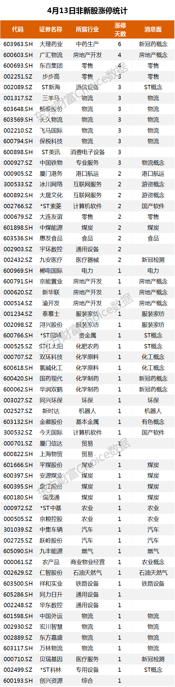 此外,13日合计有60股涨停,较上个交易日111股涨停数减少51股。申万一级行业中,煤炭、有色领涨两市。
