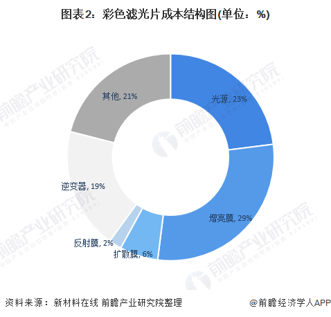 在LCD的构成组件中,彩色滤光片作为实现制色显示的关健器件占有重要地位,彩色滤光片在LCD面板总成本占比约为21%。彩色光刻胶和黑色光刻胶是制备彩色滤光片的核心材料。在彩色滤光片的成本结构,其中黑色矩阵膜和彩色光刻胶合计占到了彩色滤光片成本的约46%。