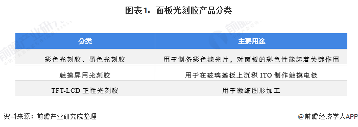 面板光刻胶主要分为彩色光刻胶、黑色光刻胶、触摸屏用光刻胶和TFT-LCD正性光刻胶。彩色光刻胶、黑色光刻胶主要用于制备彩色滤光片;触摸屏用光刻胶主要用于在玻璃基板上沉积ITO制作触摸电极;TFT-LCD正性光刻胶主要用于微细图形加工: