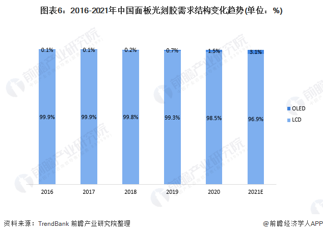 当前,我国面板光刻胶的需求主要来自于LCD领域,这主要得益于我国已是全球第一大LCD产能国;但未来,随着OLED面板渗透率的进一步提高,我国OLED光刻胶需求渗透率也将会飞速增长: