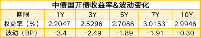 中债10年国开债收益率报2.9946%,下行0.30BP。