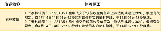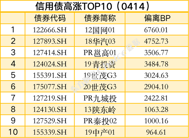 信用债方面,截至4月14日17:00,交易所成交量前三的债券为:19信投01、20长新01、22深航03;交易所涨幅前三的债券为:12国网01、18华汽03、PR邕高01。