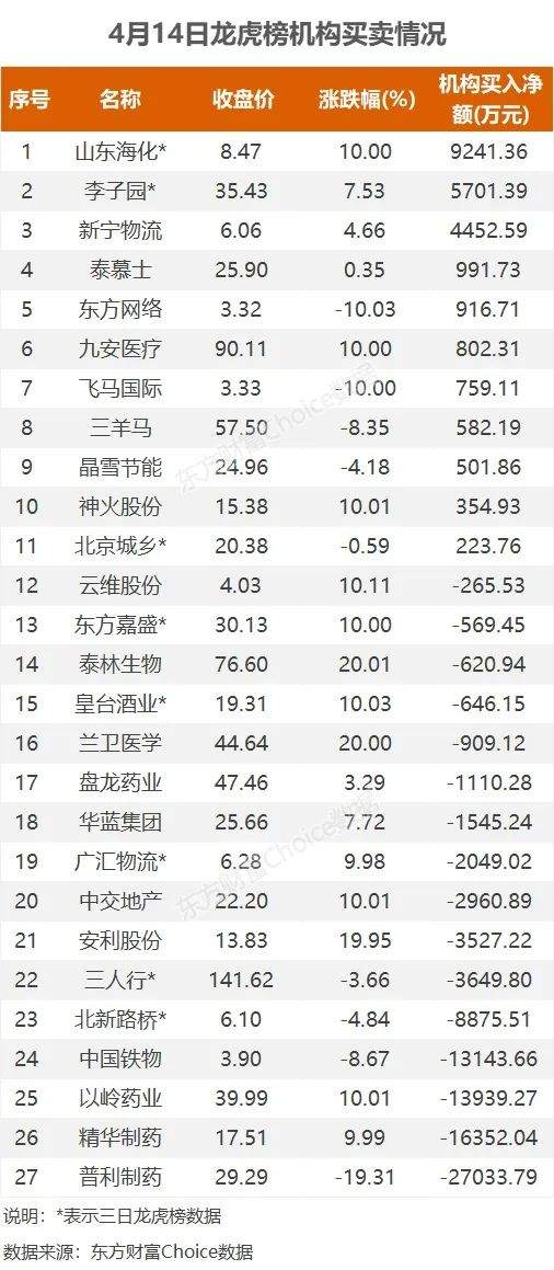 机构参与龙虎榜中个股共涉及27股,其中11股被机构净买入,山东海化被买入最多,三日净买入9241.36万元。另外16股被机构净卖出,普利制药被卖出最多,为2.7亿元。