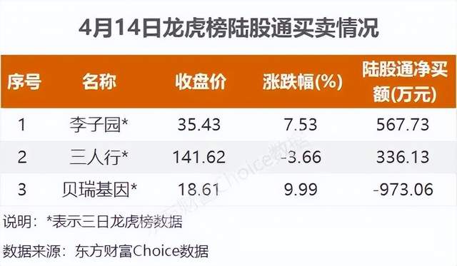 陆股通参与龙虎榜中个股共涉及3股,其中2股被陆股通净买入,李子园被买入较多,三日净买入567.73万元。贝瑞基因被陆股通净卖出,三日净卖出973.06万元。