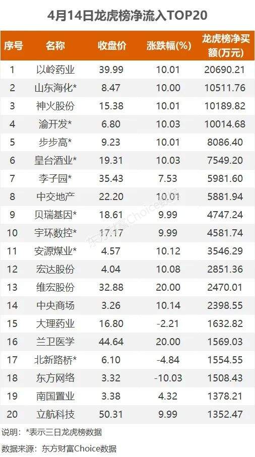4月14日,上榜龙虎榜个股中,资金净流入最多的是以岭药业,为2.07亿元。数据显示,该股日内涨停收盘,全天换手率10.51%。资金净流入居前的中金上海分公司净买入2.28亿元。
