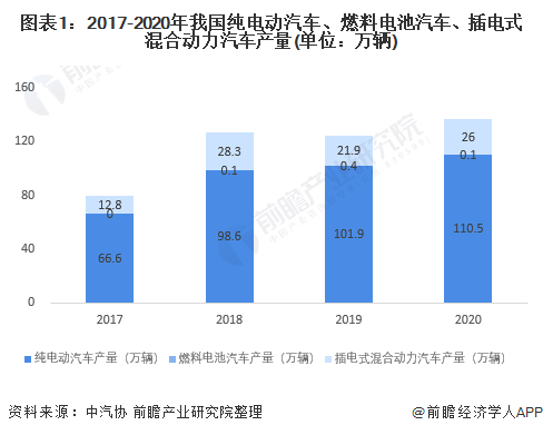 在国家及地方政府配套政策的支持下,我国新能源汽车实现了产业化和规模化的飞跃式发展。2017-2020年,我国纯电动汽车、燃料电池汽车、插电式混合动力汽车产量呈上升趋势。2020年,纯电动汽车、燃料电池汽车以及插电式混合动力汽车产量分别为110.5万辆、0.1万辆以及26万辆。