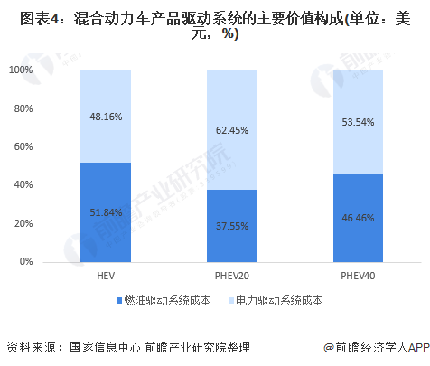 从混合动力汽车来看,目前微混动力车产品中电驱动系统(电池+电机/转换器等)占总动力系统成本的48%;而更接近纯电动车的插电式混合动力汽车(PHEV)中电驱动系统的成本占比在50%-70%,是燃油系统的两倍有余。