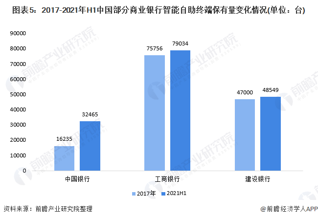 当前中国银行、工商银行及建设银行统计数据显示,截至2021年第二季度,中国银行在运营智能柜台数量为32465台,较2017年16235台增长近1倍;工商银行智能设备数量为79034台,较2018年相比增加了3200余台,建设银行在运营智慧柜员在48549台,与2017年相比有所增加。