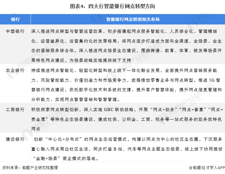 移动支付技术日趋成熟并广泛使用,国内银行业出现了去柜台化、轻资产化等转型态势,目前国内四大行网点转型相关布局如下: