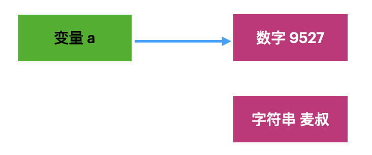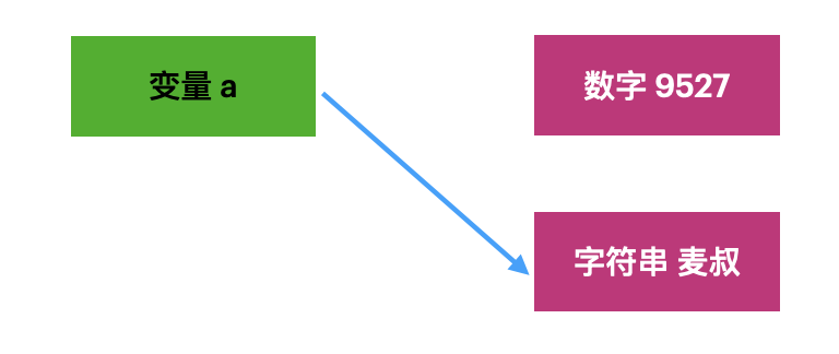 在这个过程中并不是数字9527变成了字符串麦叔,「而是变量a的指向发生了变化」。