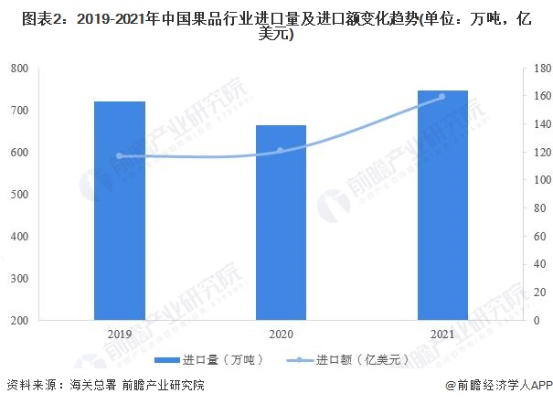 进口方面,统计数据表明,2021年我国进口的果品数量与金额较2020年均有较大幅度增加,双双再创历史新高,分别达746.76万吨和158.97亿美元,较2020年分别增加了80.17万吨和38.00亿美元,增幅分别达12.03%和31.42%。