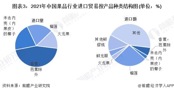 具体到进口产品来看,2021年,我国主要进口果品为香蕉、榴莲等,其中香蕉进口量占进口总量的24.96%,榴莲进口量占总进口量的11%;香蕉进口额占总进口额的6.54%,榴莲进口额占总进口额的26.45%。