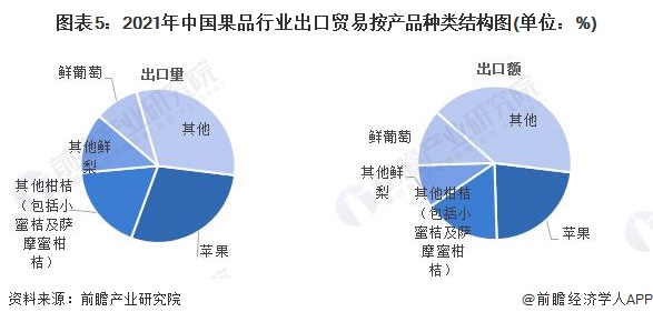 具体到出口产品来看,2021年,我国主要出口果品为苹果、其他柑桔、其他鲜梨以及鲜葡萄,出口量分别占总出口量的28.69%、17.91%、12.64%、9.33%;出口额分别占总出口额的22.57%、15.99%、9.04%和11.96%。