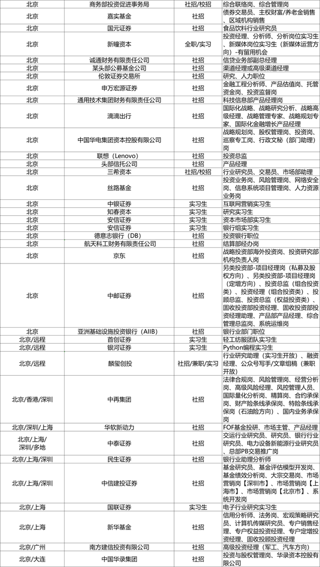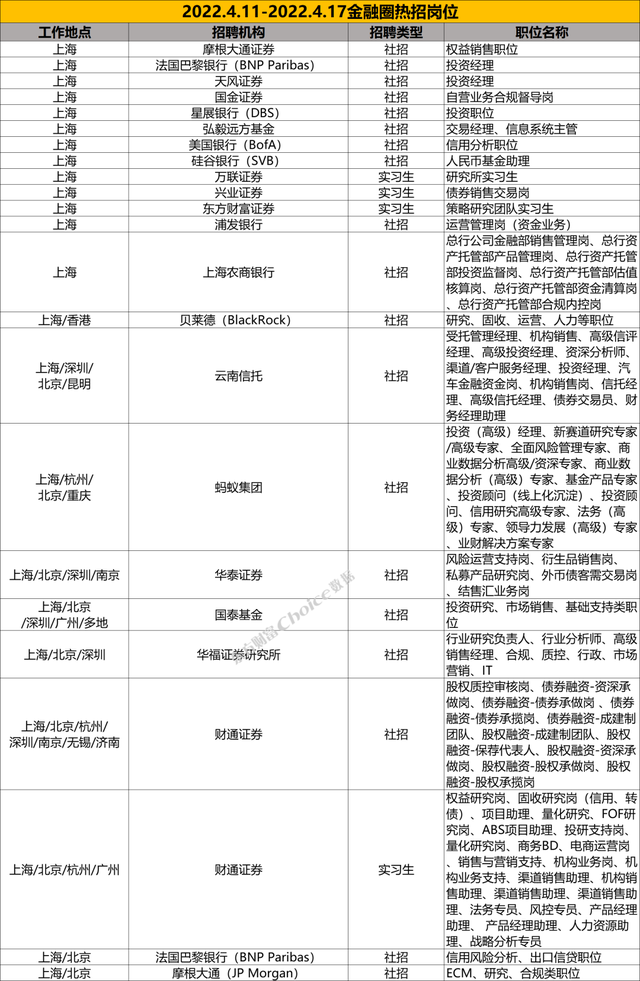 关注“东方财富Choice数据”微信公众号,会话框输入“金融圈”领取上周热招岗位详细excel表。