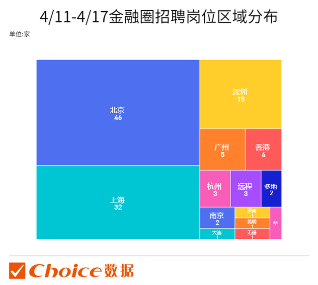 上周(4月11日至4月17日之间),共12个省市73家金融机构发布招聘信息,其中,北京46家;上海32家;深圳15家位列第三,广州和香港亦有3家金融机构发布招聘,上周有3家金融公司招聘远程办公岗位。