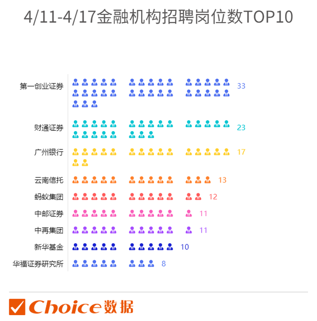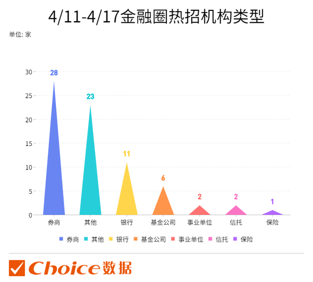 上周(4月11日至4月17日之间),共28家券商、6家基金公司,11家银行发布招聘(外资银行为主);商务部投资促进事业局和商务部国际经济技术交流中心两家事业单位发布社招;2家信托公司和1家保险公司亦发布用人需求。