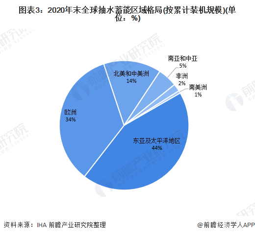 从区域发展格局来看,截至2020年末,东亚及太平洋地区的累计装机规模占比最大,达44%,该地区的装机量主要来源于中国,中国抽水蓄能已建和在建规模均居世界首位;排名第二的是欧洲,占比达34%。