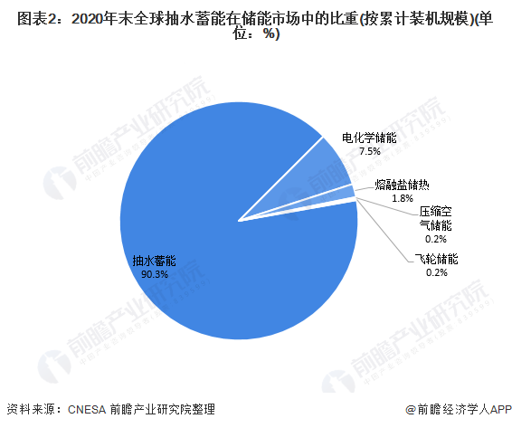抽水蓄能作为储能市场的细分市场之一,从装机规模来看,已成为全球储能市场中最大的细分市场。截至2020年末,全球抽水蓄能累计装机规模占全球储能市场的比重达90.3%。