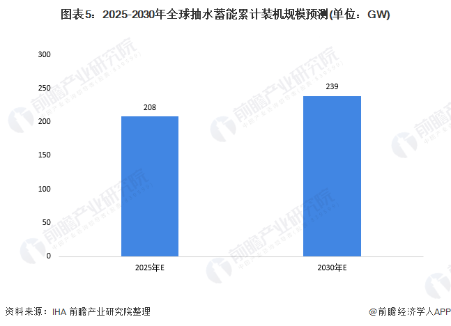 由于抽水蓄能是当前技术最成熟、经济性最优、最具大规模开发条件的电力系统绿色低碳清洁灵活调节电源,与风电、太阳能发电、核电、火电等配合效果较好。全球主要国家/地区仍对发展抽水蓄能产业持积极态度。据IHA预测,至2025年,全球抽水蓄能累计装机规模将达208GW,至2030今年,累计装机规模将达239GW。