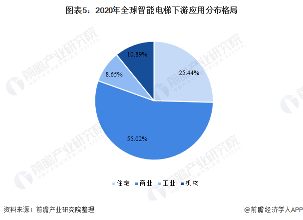 2020年全球智能电梯下游需求最大的市场是商业领域,市场占比为55.02%。由于节能技术和举措的实施,数字建筑技术将逐步渗透到商业领域。包括零售和办公综合体、购物中心在内的高层建筑的基础设施发展正在促进智能电梯系统的使用。