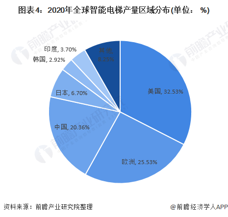 全球主要产区有美国,欧洲,中国,日本等地。其中,2020年美国智能电梯产量为163.6万台,占比第一,达到32.53%。其次是欧洲,产量为12.84万台。中国和日本排名第三和第四,占比分别为20.36%和6.70%。中国是制造业大国,生产能力超过美国和欧洲,所以在未来几年中国智能电梯市场的产量有望持续上涨,预测将会赶超欧洲,紧追美国。