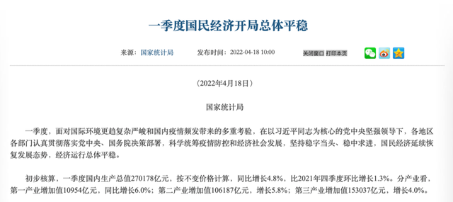 4月18日,国家统计局发布的一季度经济数据显示,一季度全国GDP同比增长4.8%,比去年四季度同比上升0.8个百分点,经济发展整体稳定。
