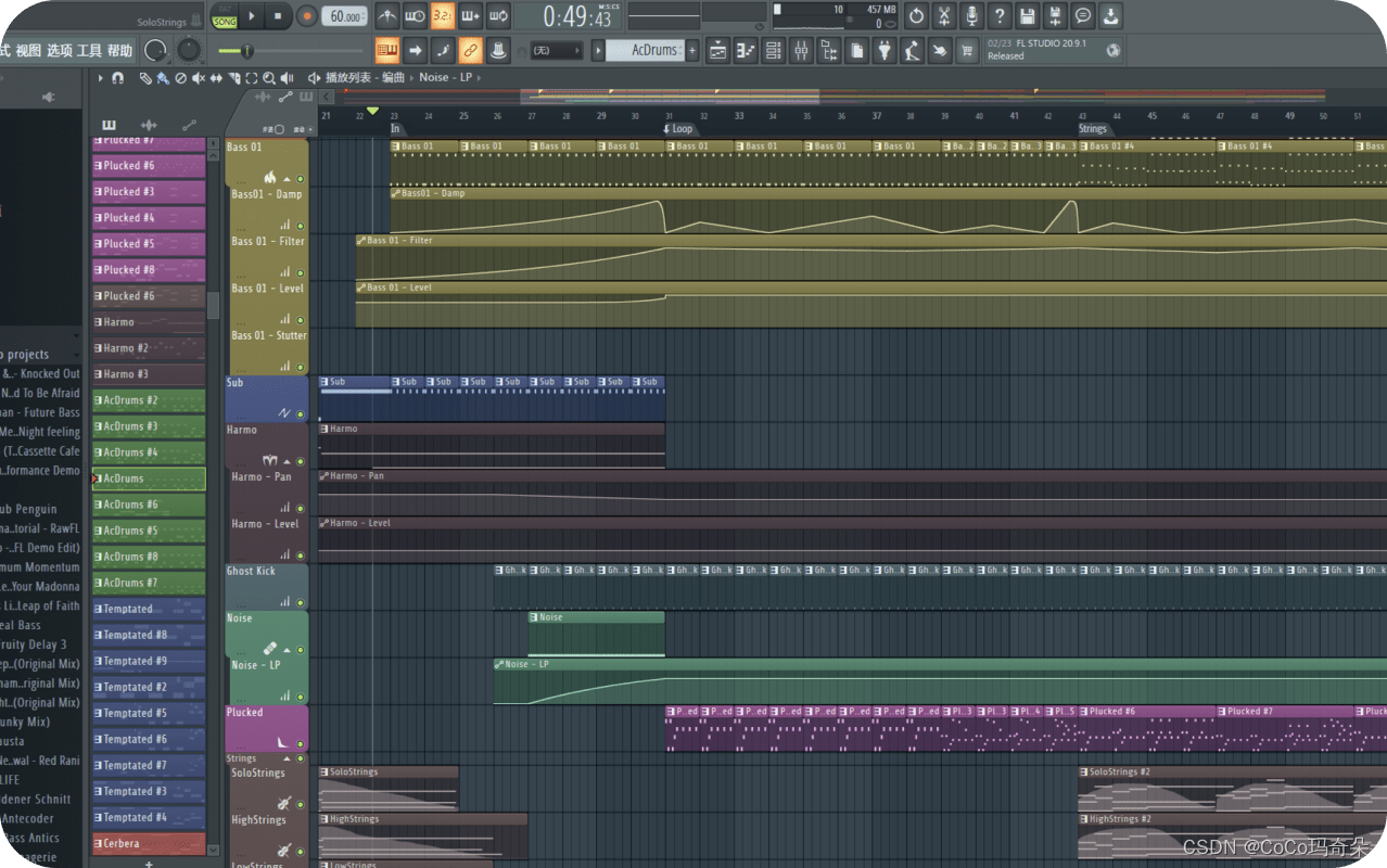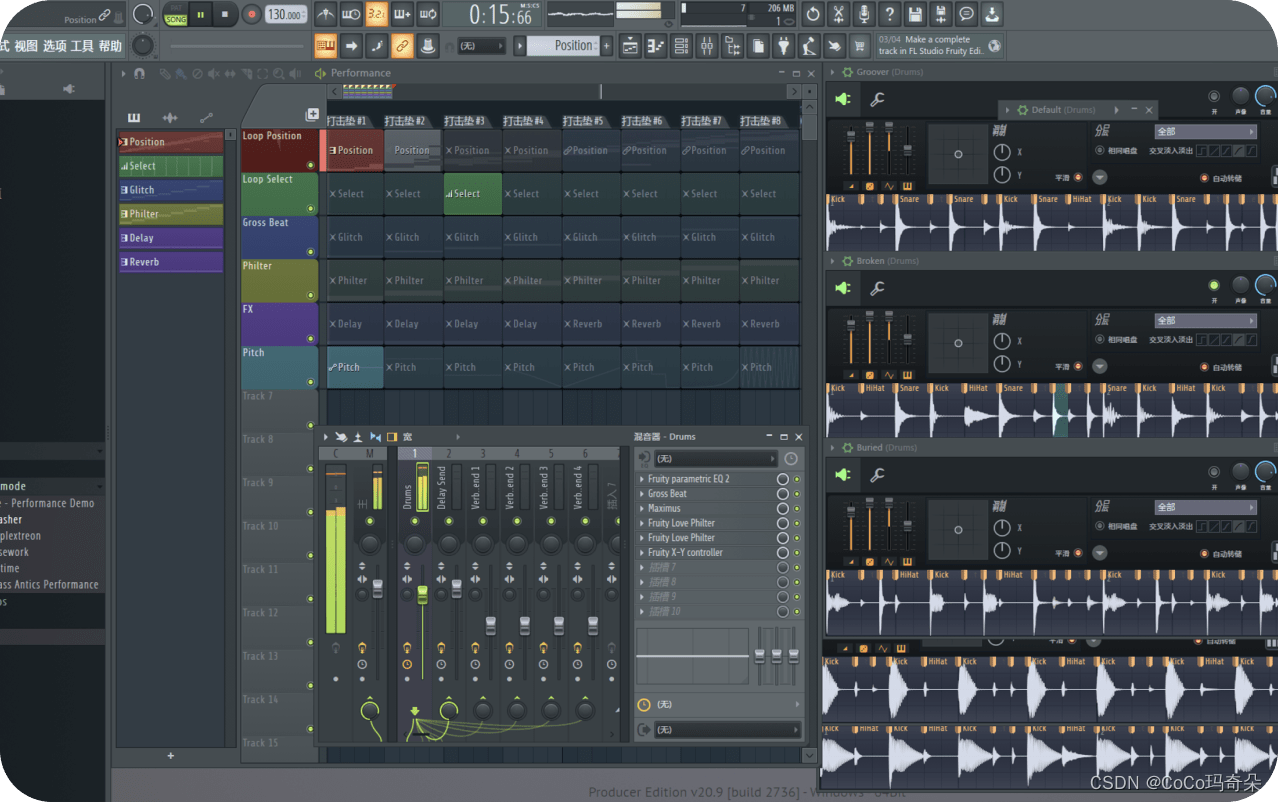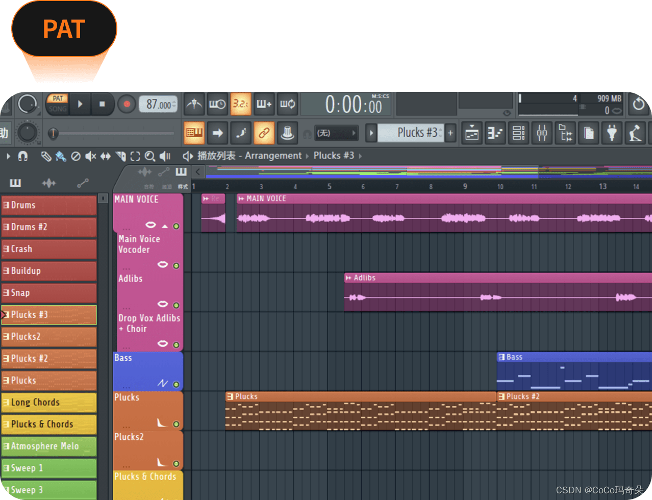 Pattern / Song双模式是FL的标志性特色,通过pattern写一个很短的部分,然后像搭积木一样叠加并排列到Song总轨,即可制作完整的音乐。对Hip-hop、EDM这种需要大量使用LOOP的风格来说,堪称神器!