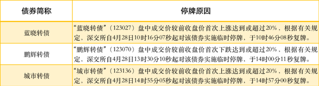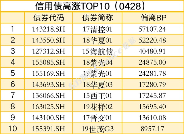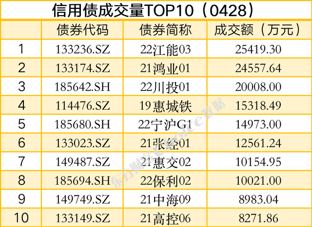 信用债方面,截至4月28日17:00,交易所成交量前三的债券为:22江能03、21鸿业01、22川投01;交易所涨幅前三的债券为:17清控01、18华夏01、15海航债。