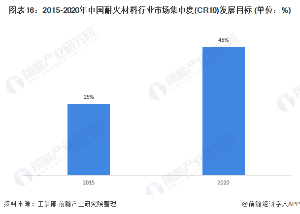 2013年,工信部发布的《关于促进耐火材料产业健康可持续发展的若干意见》中明确提出,提高产业集中度,力争到 2020 年,前 10 家企业产业集中度提高到 45%。但从当前耐火材料行业的发展情况看,与国家制定的目标相距甚远,未来耐火材料行业内的整合与行业龙头企业集中度的提升将成为必然趋势。