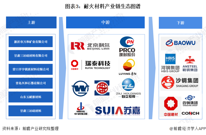 从耐火材料行业产业链主要参与企业看,耐火材料行业上游主要参与企业有新沂市万和矿业有限公司、甘肃三远硅材料有限公司、营口开宇镁质材料有限公司、青岛兴和石墨有限公司等;中游主要参与企业有北京利尔、濮耐股份、瑞泰科技、鲁阳节能等;钢铁工业为耐火材料行业主要应用领域,下游主要参与企业有中国宝武钢铁集团、河钢集团、沙钢集团、鞍钢集团等。