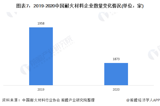 2020年是耐火材料行业最具挑战性的一年,受疫情影响,部分企业停工停产,虽然我国采取了强有效的防控防治措施,经济稳定有序发展,但是耐火材料行业仍受到一定负面影响。据统计,2020年全行业耐火材料企业总数为1873家,较2019年减少85家。