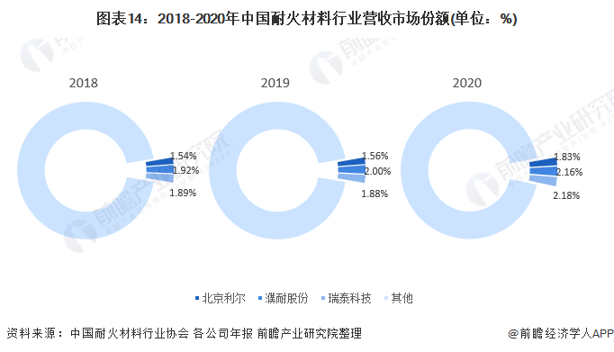 从耐火材料行业业务营收上看,2020年,据中国耐火材料行业协会统计数据显示,2020年全行业耐火材料企业总家数为1873家,主营业务收入为1936.4亿元,结合各企业年报可知,2020年,瑞泰科技耐火材料业务收入达42.16亿元,市占率达2.18%,位居行业第一;濮耐股份耐火材料业务收入达41.74亿元,市占率达2.16%;北京利尔耐火材料营收达35.41亿元,市占率达1.83%。