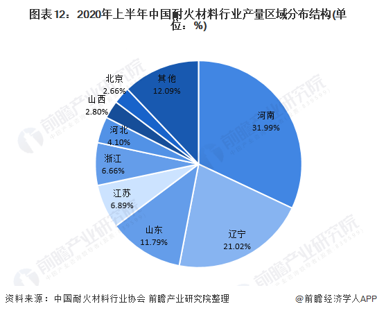 2020年上半年,全国耐火材料制品产量1048.22万吨,从产量区域分布结构看,2020年上半年,河南省耐火材料产量占比达31.99%,辽宁省耐火材料产量占比达21.02%,山东省耐火材料产量占比达11.79%,前三省市耐火材料占比高达64.80%,产量区域集中度较高。