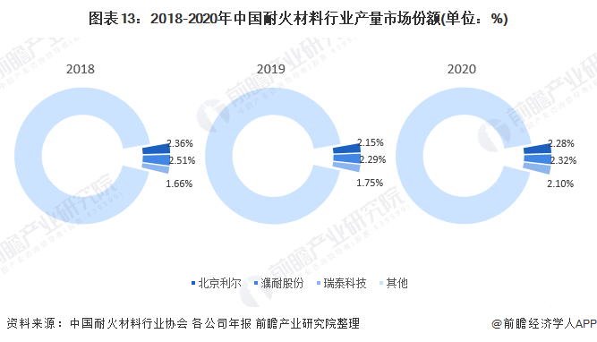 从历年的产量市场份额来看,北京利尔、濮耐股份产量市占率波动变化,瑞泰科技耐火材料产量占比逐年上升。