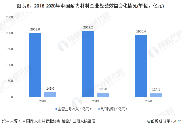 从经营效益上看,2020年,我国耐火材料企业主营业务收入及利润总额较2019年均有所下降,企业经营效益下滑。