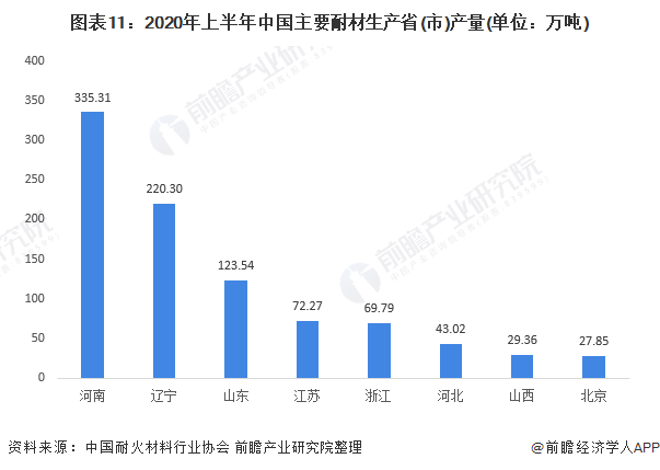 2020年上半年,在我国耐火材料主产区中,河南省上半年产量335.31万吨,同比下降36.20%,远高于其他地区,发展优势明显;辽宁省上半年产量220.30万吨,同比下降2.22%;山东省123.54万吨,同比下降3.37%;江苏省上半年产量72.27万吨,同比下降5.53%;浙江省上半年产量69.79万吨,同比下降13.01%。