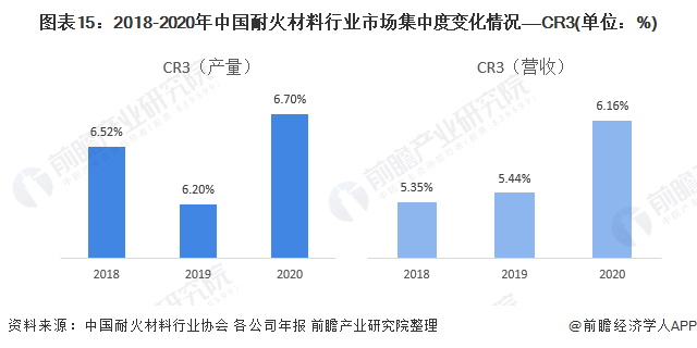 从产量集中度看,2018-2020年,我国耐火材料行业CR3企业产量集中度波动变化,2020年上升至6.70%,较2018、2019年有所上升。从营收集中度看,2018-2020年,我国耐火材料行业CR3企业营收集中度逐年上升,2020年达6.16%。但从整体上看,我国耐火材料行业市场集中度较小,市场较为分散。
