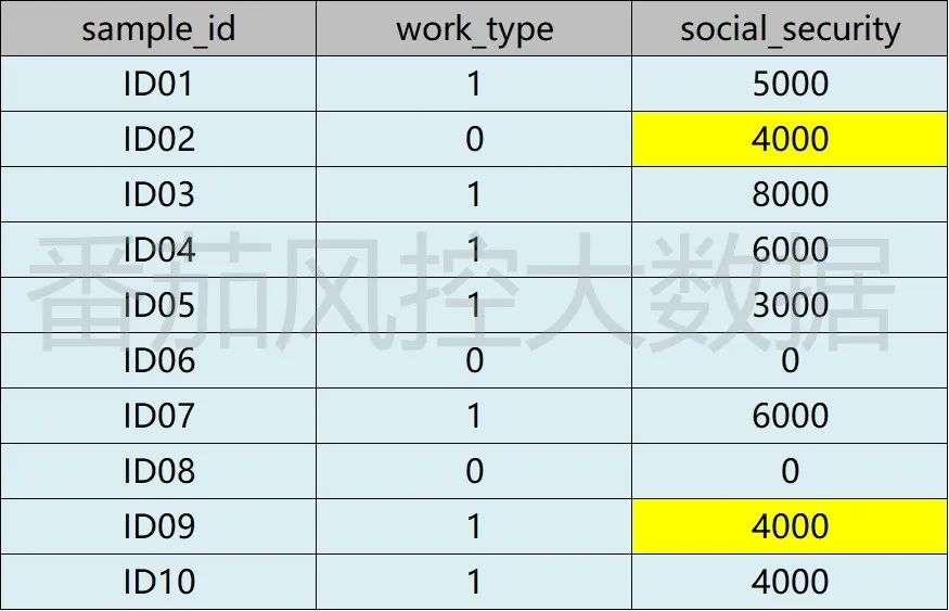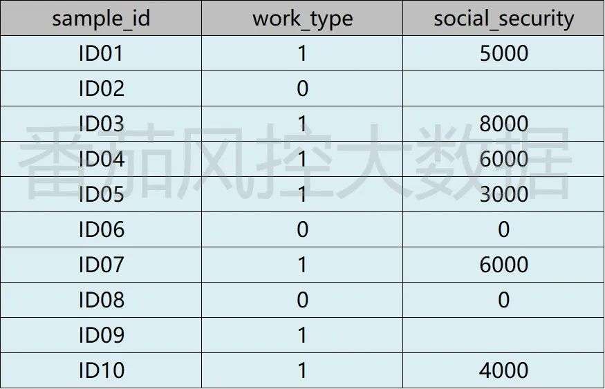 当采用常规方法实现缺失值的处理后,虽然达到了关于数据清洗的需求,但是在很多场景下对数据样本的实际分布会产生较大偏差。现举个例子进行说明,样本数据如图1所示,共包含10个样本(ID01~ID10),work_type是指工作属性(1代表有工作,0代表无工作),social_security是指社保金额(元)。