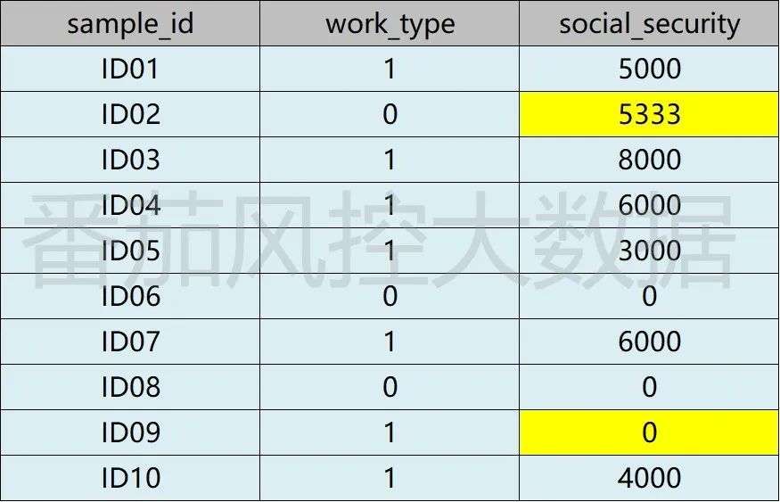 对于样例1字段social_security的缺失情况,假设采用平均值进行填充,若直接对字段全量平均值处理,则ID02与ID09的填充结果如下所示: