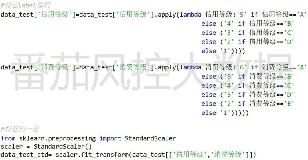 从图4样本可知,字段“信用等级”与“消费等级”均属于字符型,需要将其转换为数值型,可以采用标签编码实现此过程。另外,由于聚类算法DBSCAN是基于样本的距离进行模型训练的,因此为了排除各特征量纲的影响,还需要对特征进行标准化,这里采用z-score标准化(归一化)。具体实现代码如图7所示,输出结果如图8所示。