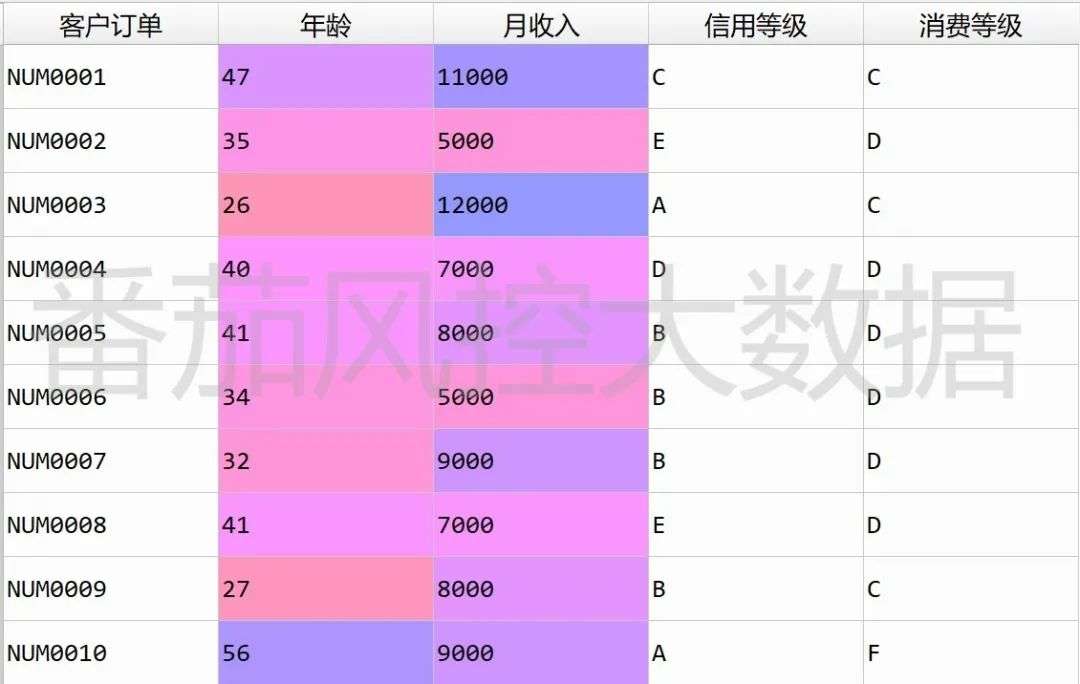 现有一份样本数据,包含2000条样本和5个特征,各字段的标签含义分别为客户订单(主键)、年龄、月收入、信用等级、消费等级,取数据集前10条样本具体如图4所示。