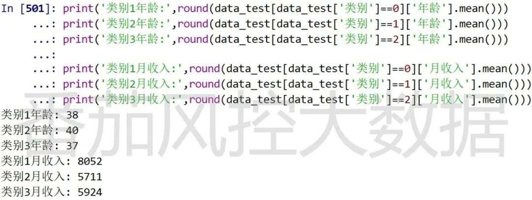 通过特征聚类分析,将样本数据划分为3个类别,并输出每类群体的特征分布指标,即“年龄”与“月收入”的平均值(图11)。从结果来看,对于每类用户群体,在“信用等级”和“消费等级”指标相似的情况下,平均“年龄”和平均“月收入”还是有着较明显差异,尤其是“月收入”指标,类别1与类别2相差较大。接下来我们根据不同样本类别的分布情况,针对性进行字段缺失值填充,具体代码的实现过程如图12所示。