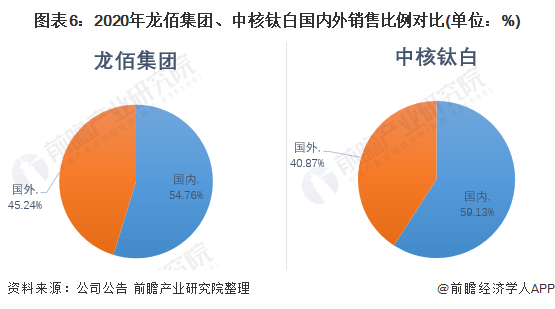 从国内外销售比例来看,龙佰集团和中核钛白都有较多的国外业务。其中,龙佰集团的国外业务营收比例达到45.24%,中核钛白的国外业务营收比例稍弱,达到40.87%。