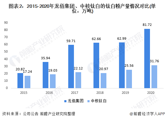 在我国钛产品市场中,不管是产量还是销量,钛白粉都占据绝大部分市场份额。目前,中国钛白粉市场的龙头企业分别是龙佰集团、中核钛白,两家企业在钛白粉业务上的布局历程如下:
