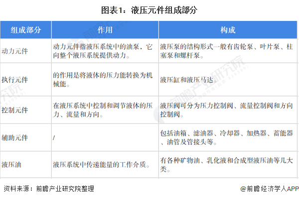 液压元件产品主要包含动力元件、控制元件、执行元件、辅助元件、液压油几个部分。其对应的液压产品主要分为液压器,液压阀,液压马达、液压油缸、减速机,邮箱、滤油器、油管及接头、密封阀、压力表,液压油、传动液等。我国液压产品具备安全、高效、功能明晰的产品特征。